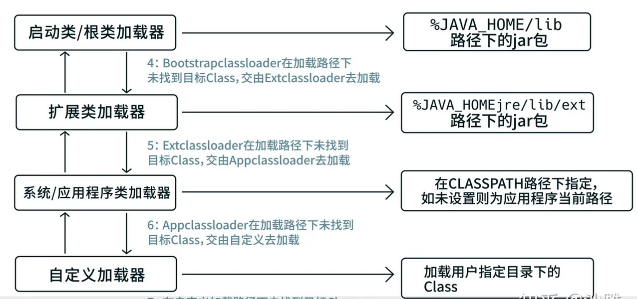 当一个类收到了类加载请求,他首先不会尝试自己去加载这个类,而是把这个请求委派给父类去完成每一个层次类加载器都是如此,因此所有的加载请求都应该传送到启动类加载其中,只有当父类加载器反馈自己无法完成这个请求的时候(在它的加载路径下没有找到所需加载的C1αss),子类加载器才会尝试自己去加载。