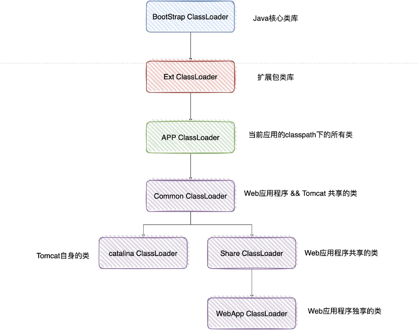 Tomcat就在WebAppClassLoader上加了个父类加载器(SharedClassLoader),如果WebAppClassLoader自身没有加载到某个类,那就委托 SharedClassLoader去加载