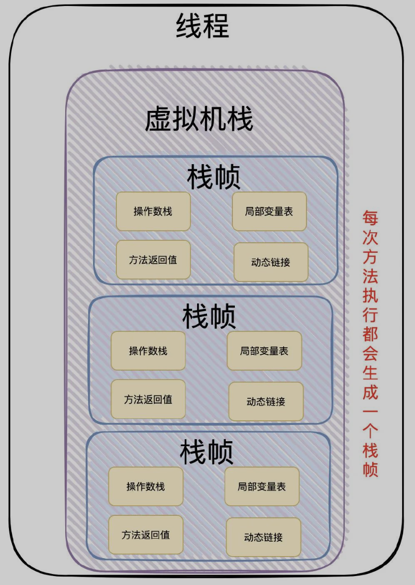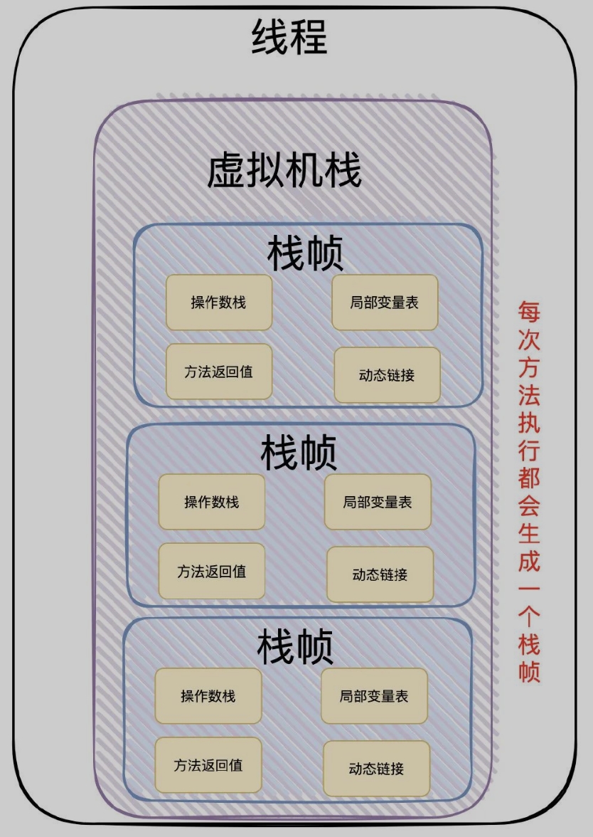 虚拟机栈:线程创建的时候会创建一个单独的虚拟机站,在调用一个方法的时候就会创建一个栈帧(包含局部变量表、操作数栈、动态链接、返回地址...)