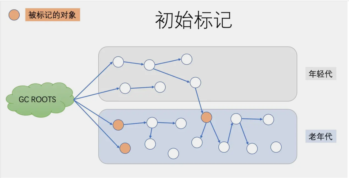 标记GCRoots直接关联的对象以及年轻代指向老年代的对象(只是标记一下GC Roots能直接关联到的对象,速度很快)