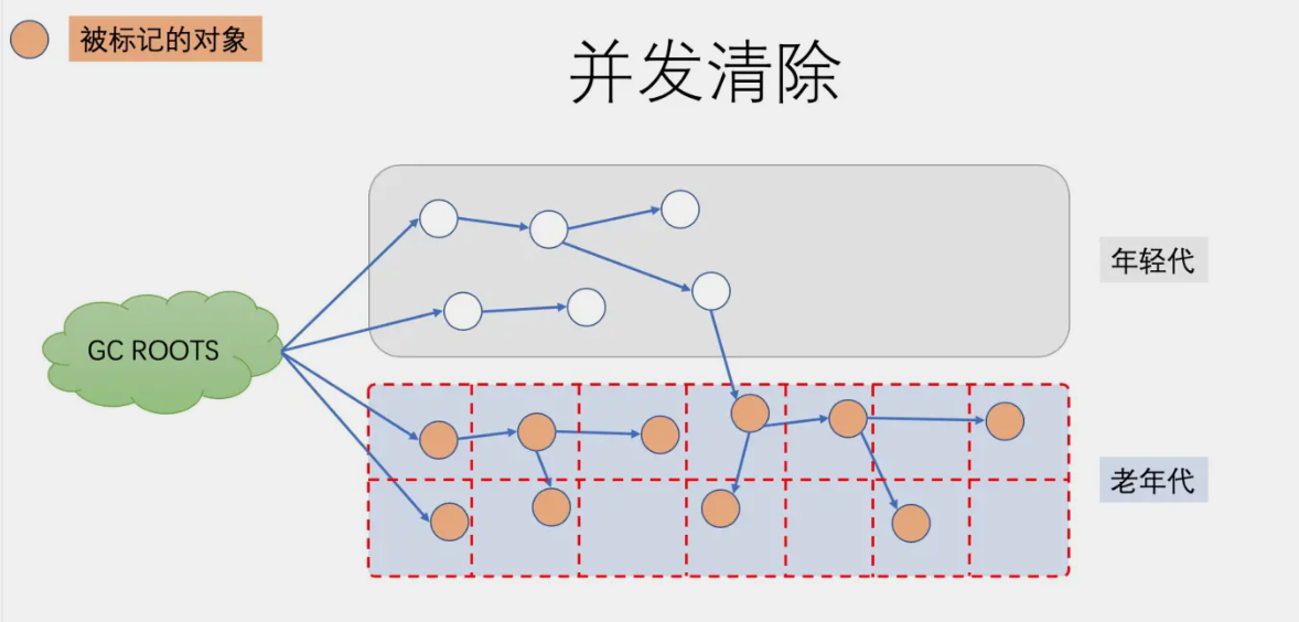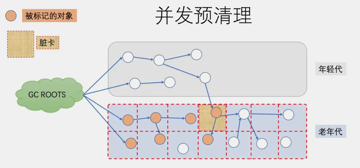 也是用于标记老年代存活的对象,此阶段仍然是与应用线程并发执行的,不需要停止应用线程。 目的: 让下一阶段重新标记的STW时间尽可能短 标记目标: