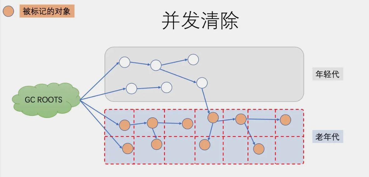 此阶段与应用程序并发执行,不需要STW停顿。JVM在此阶段删除不再使用的对象,并回收他们占用的内存空间。因为前面阶段已经把所有还在使用的对象进行了标记,因此此阶段可以与应用线程并发的执行。
