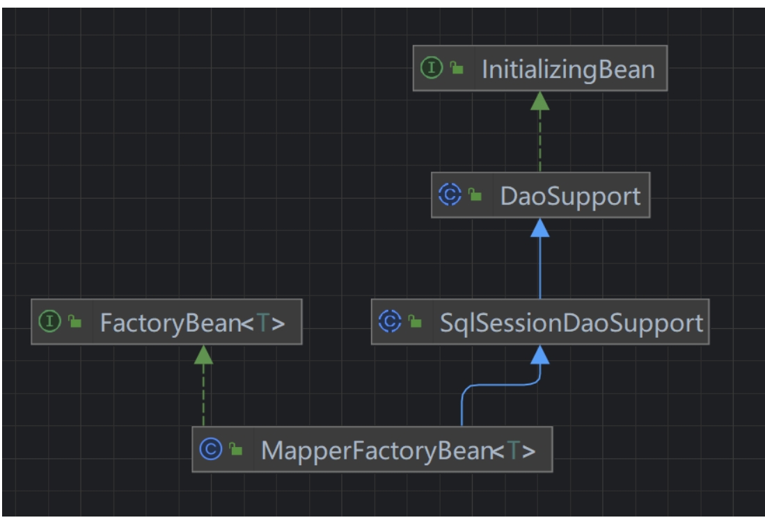 关于生成mapper的代理 ,mybatis有一个核心的工厂类MapperFactoryBean,下面看看他的继承结构: