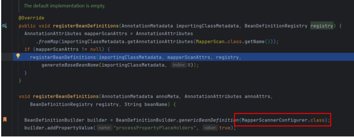 答案就是在@MapperScan里,@MapperScan这个复合注解里面引入了@Import,里面包含了一个MapperScannerRegistrar,这个类实现了ImportBeanDefinitionRegistrar接口并在实现的方法中导入了MapperScannerConfigurer作为一个bean,