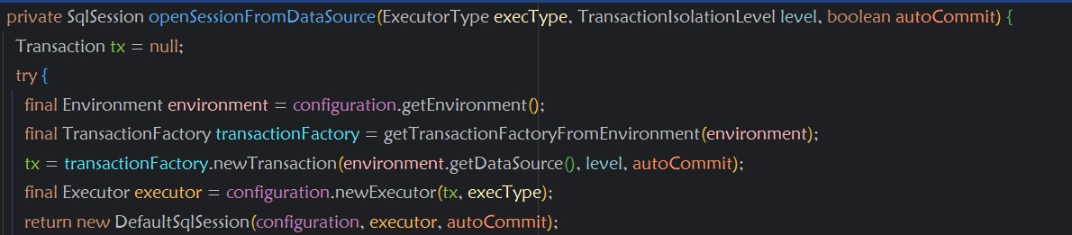 DefaultSqlSessionFactory调用openSession()方法生成DefaultSqlSession,形参有Executor,Configuration,是否开启事务