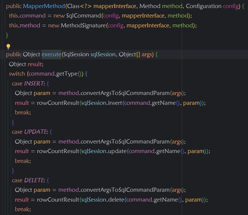 -->查找代理对象的MapperProxy中的methodCache中缓存的MapperMethodInvoker(MapperProxy的内部接口)对象(根据方法名和参数名),如果找到了对应的 MapperMethodInvoker对象,则使用该对象来执行 SQL 语句。如果没有找到对应的 MapperMethodInvoker 对象,则根据方法名和参数类型来构造一个新的 MapperMethodInvoker 对象,并保存在 MethodCache中供下次使用。