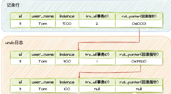 如果同时有多个事务来操作这一条数据,为了避免多事务并发场景下出现数据不一致的问题,InnoDB存储引擎会通过一条"链表"吧事务的"数据快照"串联起来: