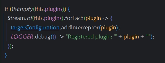 SqlSessionFactoryBean在调用buildSqlSessionFactory()生成SqlSessionFactory实例的时候,会给它的成员变量Configuration对象添加拦截器
