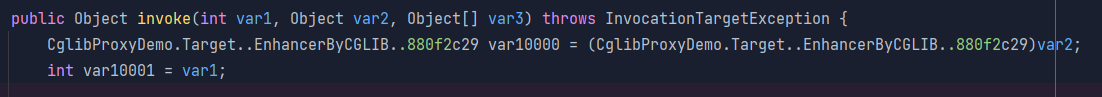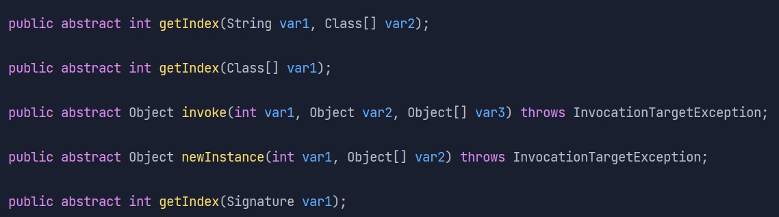 直接上结论吧,相当清晰,getIndex() 方法查找到对应的索引,然后MethodProxy 又基于这个索引调用FastClass 的invoke(int var1, Object var2, Object[] var3),FastClass 再基于索引调用对应的方法