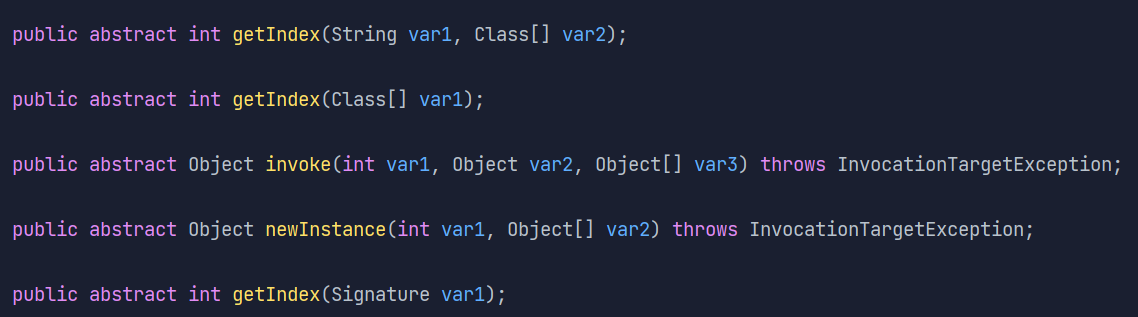 我们先来看看FastClass的getIndex() ,因为结合init() 和invoke(Object obj, Object[] args) invokeSuper(Object obj, Object[] args) 方法我们能看出我们对FastClass的方法调用还与这个方法有关。